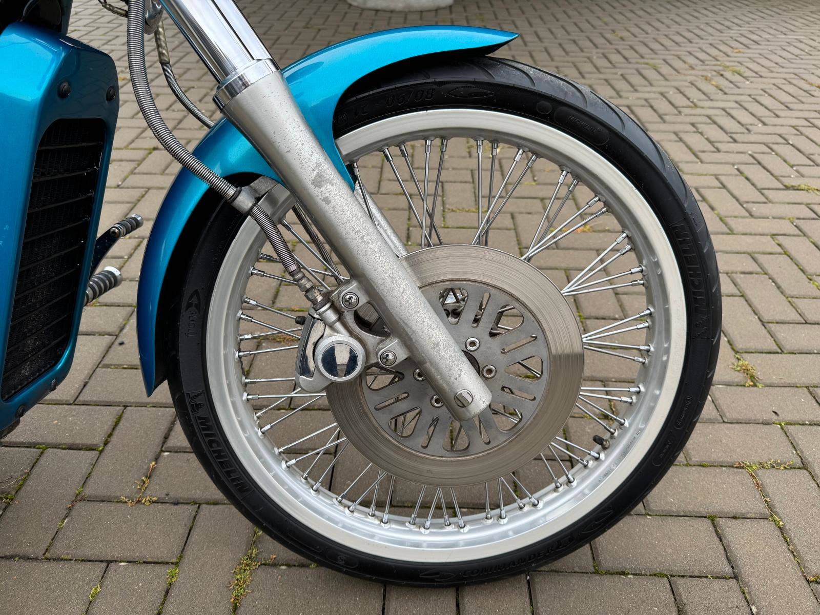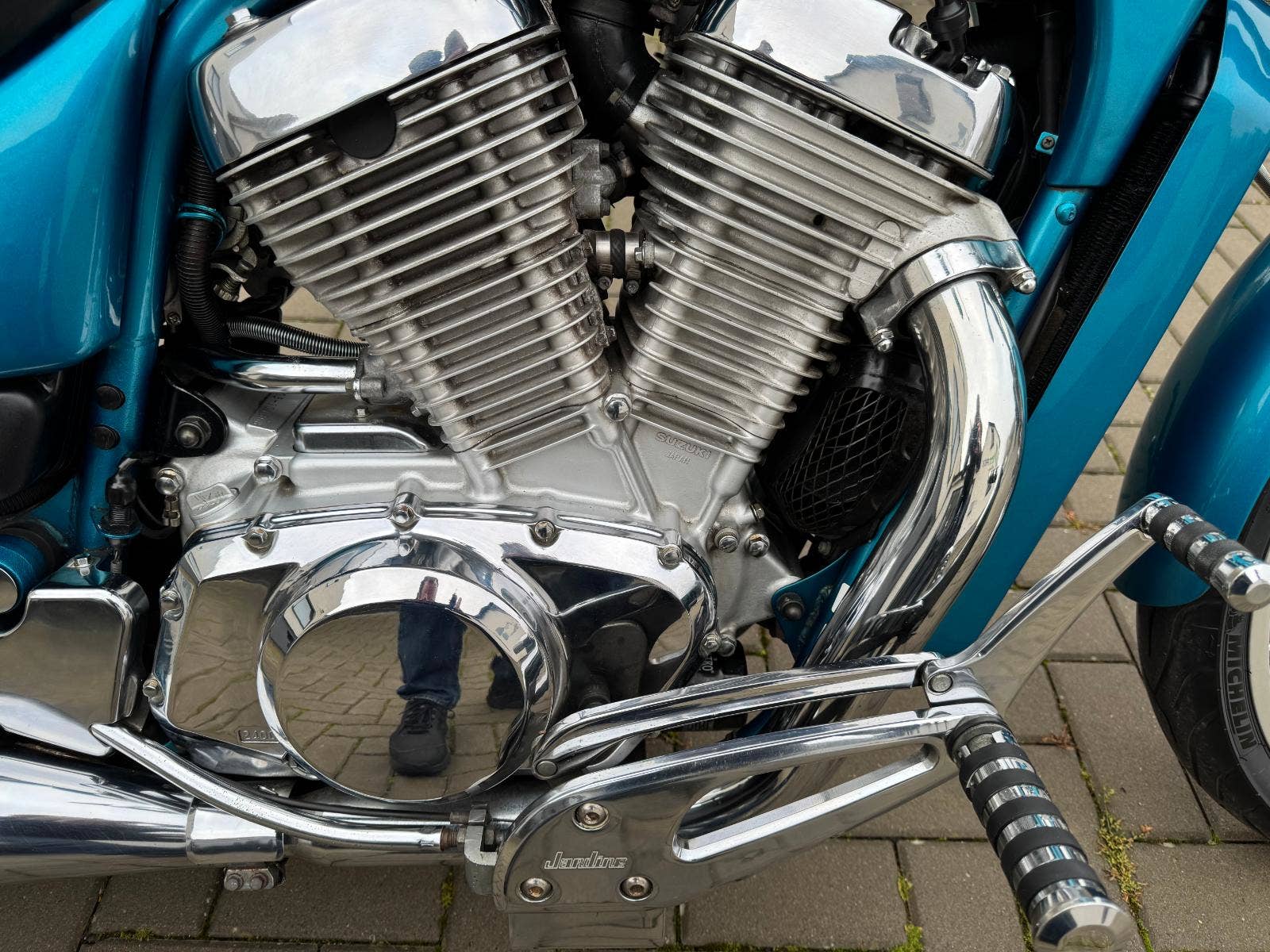 Suzuki VS 600 GL Intruder, 1. registrace 1995, najeto 49.000 km, výkon 33 kW - Lze řídit s řidičským oprávněním A2, stupačky Highway Hawk Jardine + originální stupačky k motorce, opěrka spolujezdce. Udržovaná motorka ve velmi hezkém stavu, sedlo neprosezené, neošoupané, ráfky kol nezoxidované, pěkný lak v nádherné tyrkysové barvě, kterou na silnici jen tak nepřehlédnete. 2x klíč.