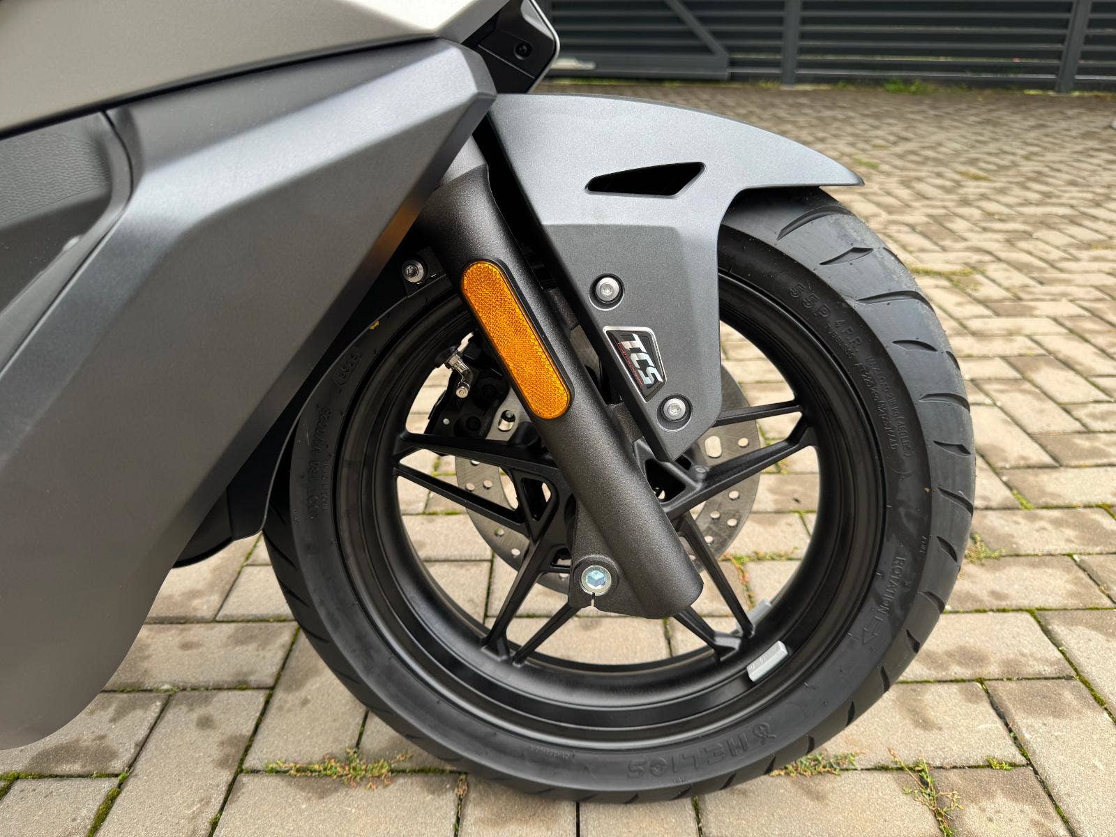 K dispozici máš sofistikovaný systémy aktivní bezpečnosti nejnovější generace. Nezávislý dvoukanálový ABS, vypínatelnou kontrolu trakce TCS i výstrahu při nouzovým brzdění ESS. Všechno je na palubě už z výroby. K tomu integrovaná palubní kamera s detektorem nárazu, kterej automaticky uloží záznam při nehodě. Elektrika je fajn, ale při brzdění spolíhám na starý dobrý železo, tedy dvoupístkový třmeny a kotouče. Ten vpředu má průměr 260 mm, zadní 240 mm. Na skútr slušný, co říkáš?